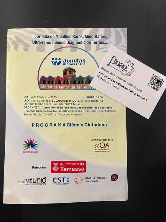 La presencia de BOAG en las Jornadas de Enfermedades Raras de Terrassa ha supuesto una nueva oportunidad para compartir el trabajo que realizamos en apoyo a las familias afectadas por la deficiencia de la beta oxidación de ácidos grasos y dar a conocer nuestra misión.