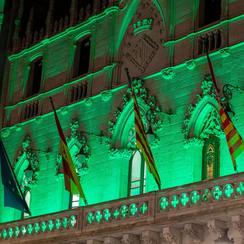 A esta iniciativa también se ha sumado el Ayuntamiento de Terrassa, que ha iluminado su edificio consistorial y el Monumento de la Mujer Trabajadora de color verde, como muestra de apoyo a todas las familias afectadas por enfermedades mitocondriales.
